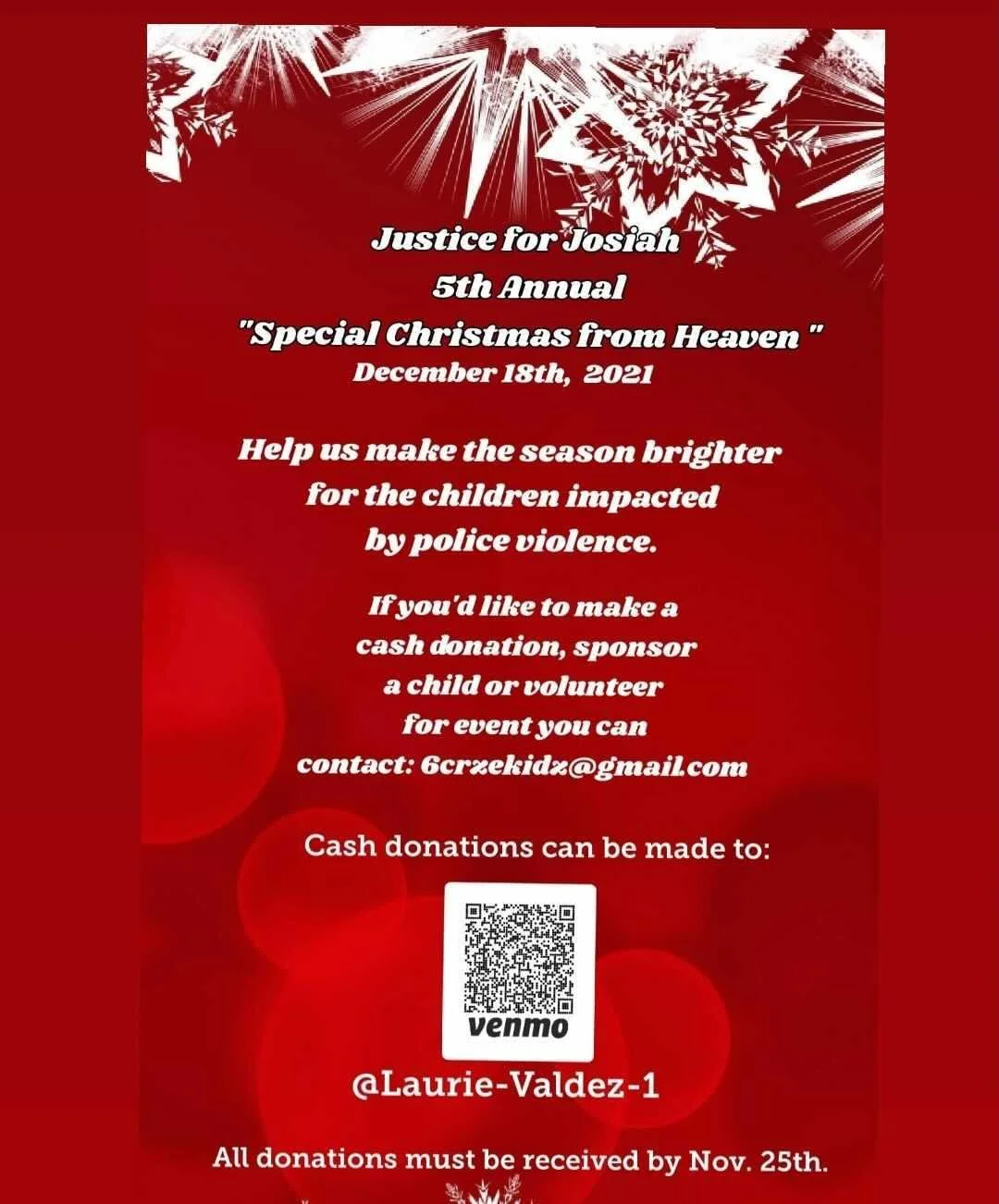 Our partners at Silicon Valley De-Bug host this annual event to support families and children who have been impacted by police violence. Email 6crzekidz@gmaillcom if you think you can volunteer at the event. You can donate through the QR on this flyer: