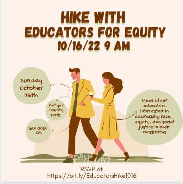 This event is put together by a group of friends across South Bay school districts looking to build connections and community with other educators who are working to make education more equitable. Our team has connections to TEYA (Teachers Empowering Youth Activists), SJUSD Equity Coalition, and SURJ@SacredHeart. Join other educators in Santa Clara County on this mindful hike as we get ready for a new school year!