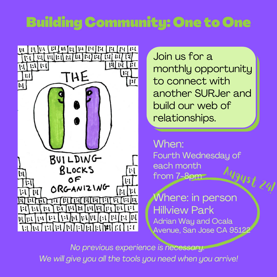 Join us once a month and be partnered with another SURJer for a community building one-to-one conversation (what organizers call a “relational meeting.”) We will hold these events on the 4th Wednesday of each month. This month’s event will be in person at Viva Parks in Hillview Park. We will meet for one to ones at Hillview Park (just northwest of Reid Hillview Airport) at Adrian Way and Ocala Avenue, San Jose CA 95122.