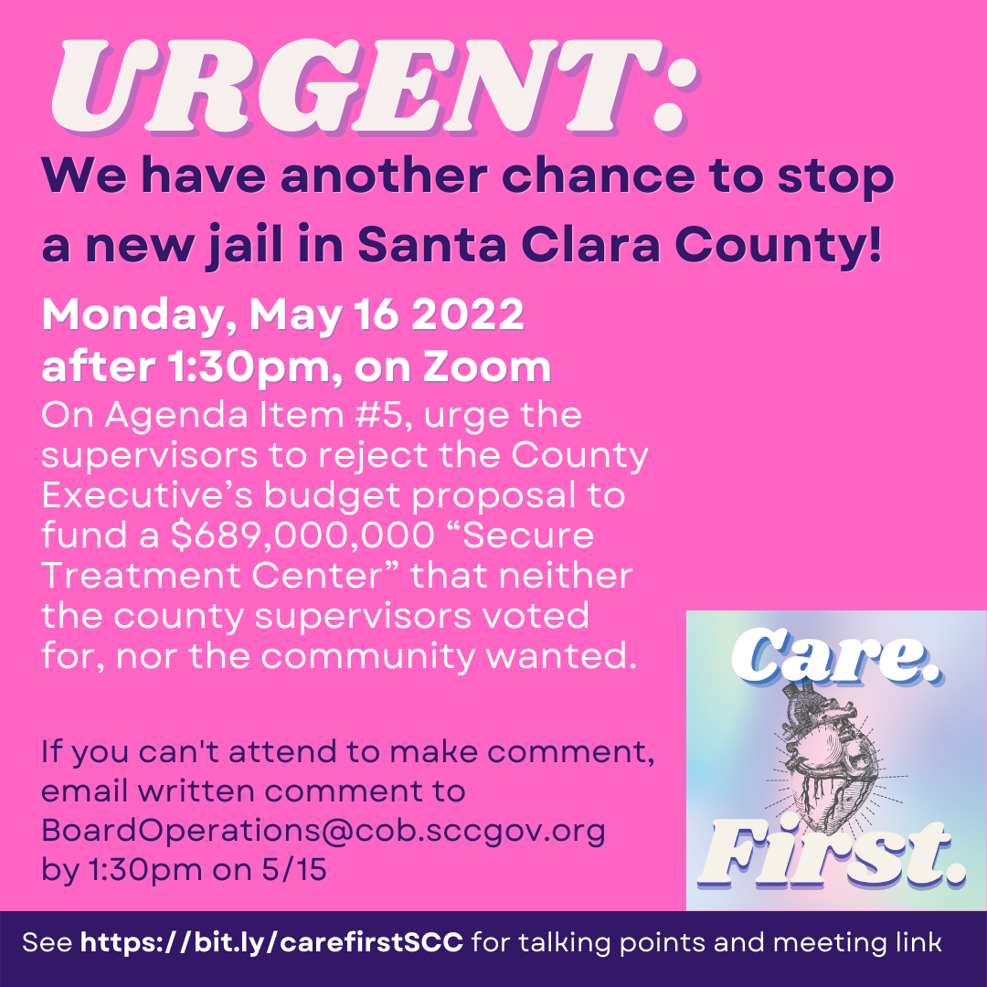 The county executive’s budget proposal for Santa Clara County 2022-2023 includes $689,000,000 for something called a “Secure Treatment Center.” This is neither the maximum security jail nor the noncarceral mental health facility run by Behavioral Health that Supervisors Wasserman, Simitian and Lee voted for on January 25th, and it is also significantly more expensive than the $390 million the county was originally planning to spend. Read Silicon Valley De-Bug’s full letter to the county supervisors for more context. A capital project like this will be discussed at the Monday May 16th budget workshop as part of the Finance and Government Operations Committee budget. We don’t know exactly when public comment on Agenda Item 5 will begin, and the agenda mentions that the budget workshop will continue into the evening if necessary. We just know that the meeting begins at 1:30pm.