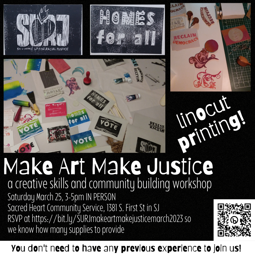 Make Art Make Justice is an ongoing series of community and creative skills building workshops. They are a great place to meet other SURJers, work alongside them, and learn new creative skills that we can use in our work to further racial justice locally. You don’t need to identify as an artist or craftsperson or creative to have a good time at these workshops. Please RSVP at https://bit.ly/SURJmakeartmakejusticemarch2023