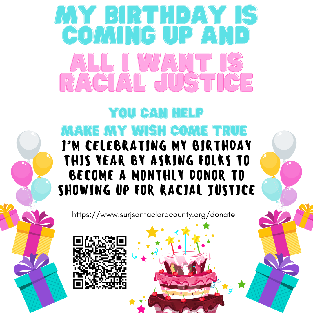 My birthday is coming up and all I want is racial justice. You can help make my wish come true. I’m celebrating my birthday this year by asking folks to become a monthly donor to Showing Up for Racial Justice. https://www.zeffy.com/fundraising/095dd4a6-f1b6-4b90-9bfc-94eefdd049c9 **There are images of balloons, wrapped gift boxess, a birthday cake with sparklers, and a QR code that directs to the same link.